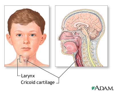 The larynx is a tubular structure in the neck, through which air passes to the lungs. The thryoid and cricoid cartilage form the narrowest section of this airway.